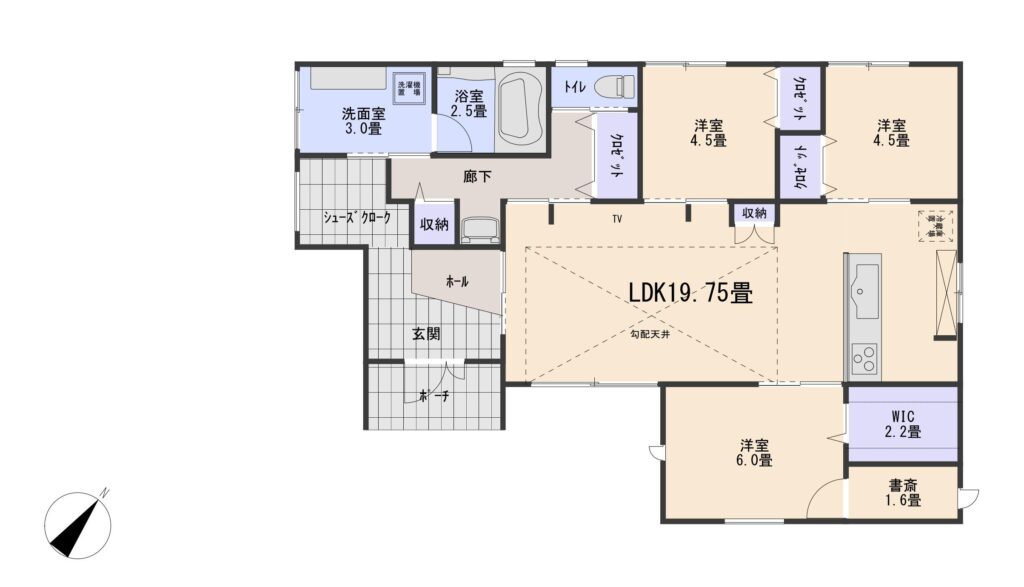 | 間取 | 3LDK+S | 間取詳細 | LDK19.75畳 洋6畳・4.5畳・4.5畳 WIC2.2畳 |